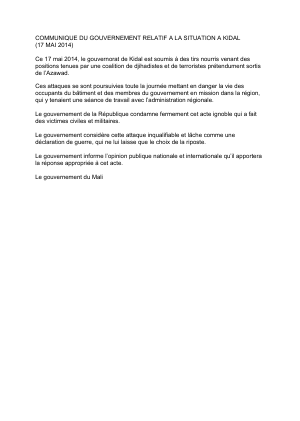 Communiqué du gouvernement relatif à la situation à Kidal (17 Mai 2014)